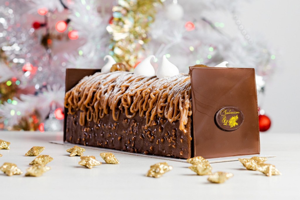 Bûche ardéchoise : Authentique et chaleureuse, la bûche Ardéchoise marie la douceur du marron à la fraicheur d’une marmelade de myrtille sauvage. Un biscuit moelleux et un sablé à la chataîgne accompagne une mousse fondante et un crémeux marron pour une gourmandise aux accents de terroir et de fête.