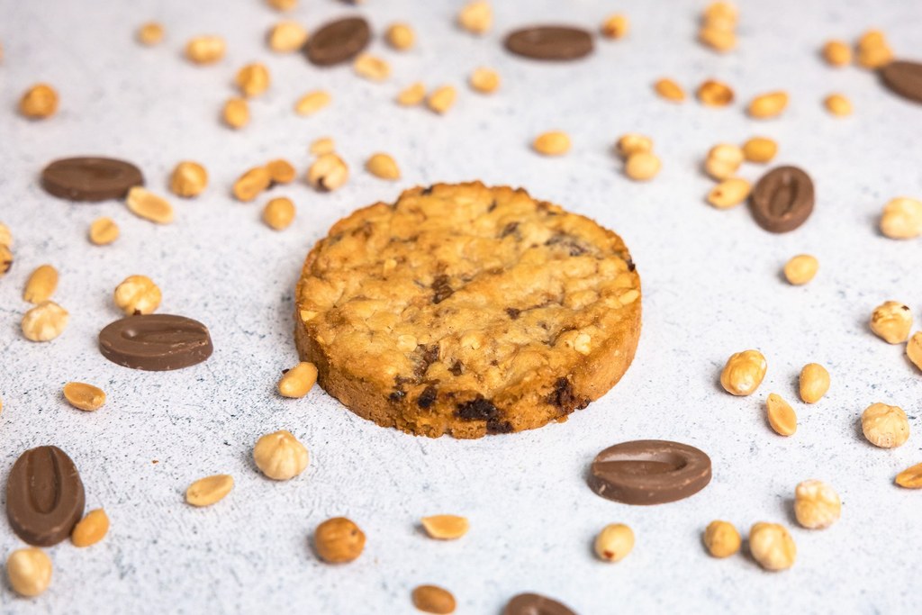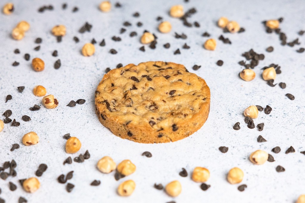 Cookie noisette et pépites de chocolat : Un cookie moelleux au éclats de noisettes torréfiées et aux pépites de chocolat fondant, riche en saveurs authentiques.