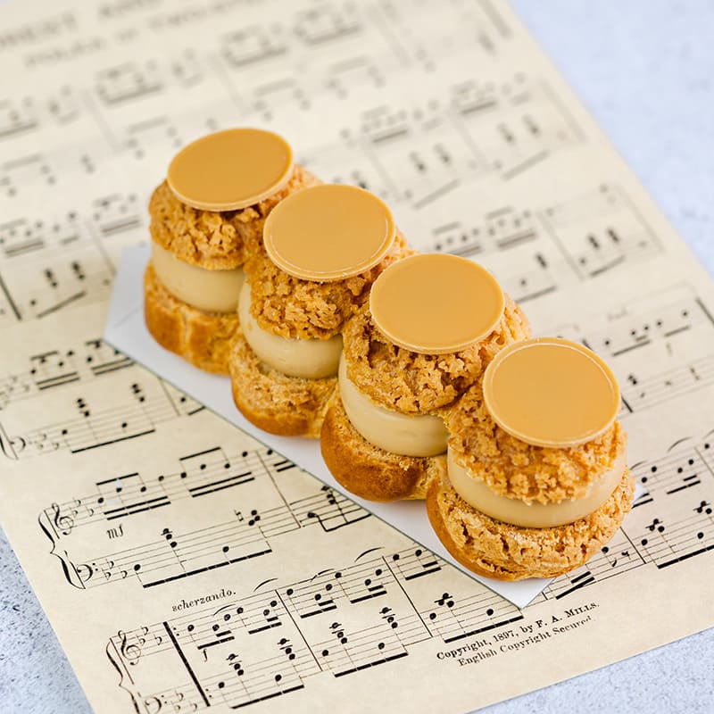 Un éclair fondant garni d’une crème onctueuse au chocolat Dulcey, entre douceur et gourmandise.