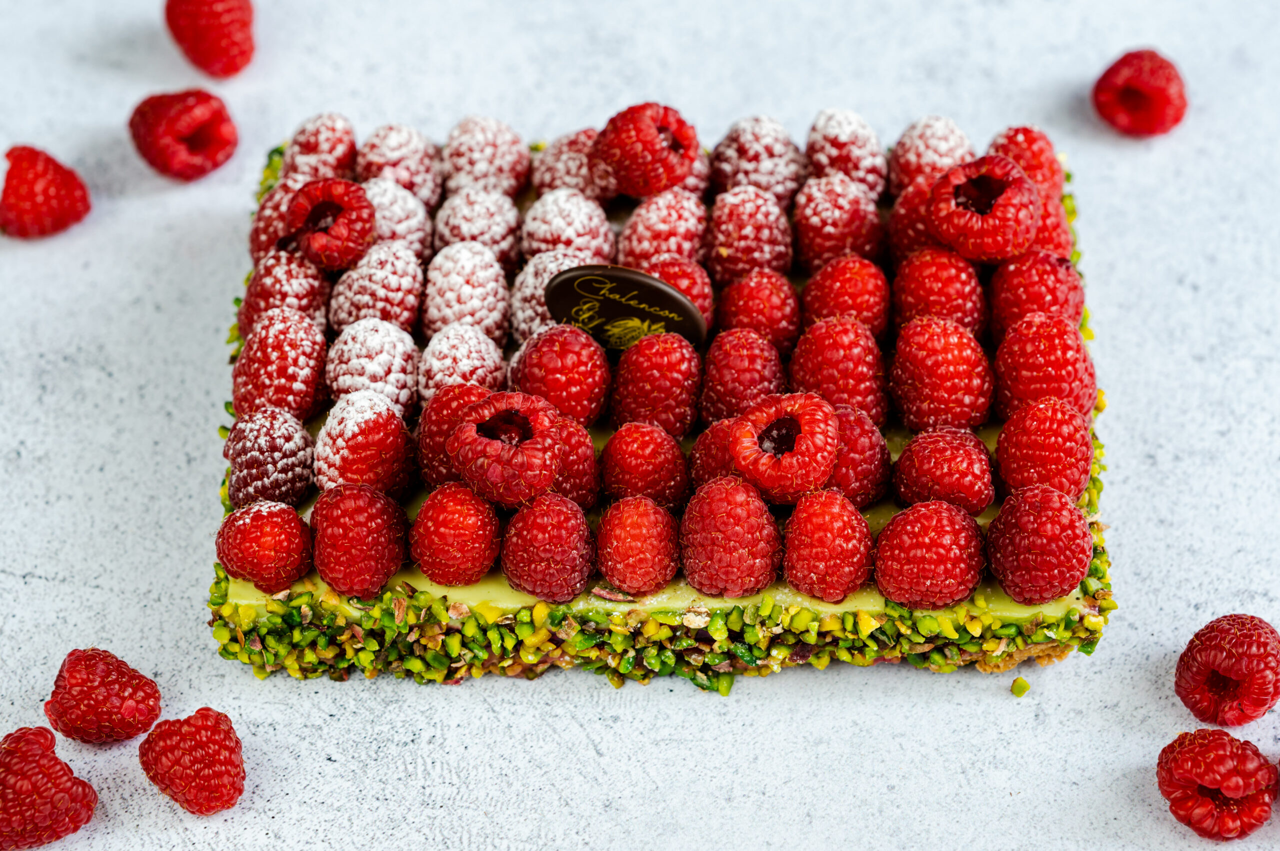 Le Fraîcheur : Éclat de couleurs et de saveurs, Le Fraîcheur séduit par son équilibre entre intensité fruitée et douceur gourmande. Sur un biscuit reconstitué croustillant, se déposent une gelée de framboise vive et acidulée, un crémeux pistache d’une grande finesse, et de framboises fraîche qui subliment l’ensemble.