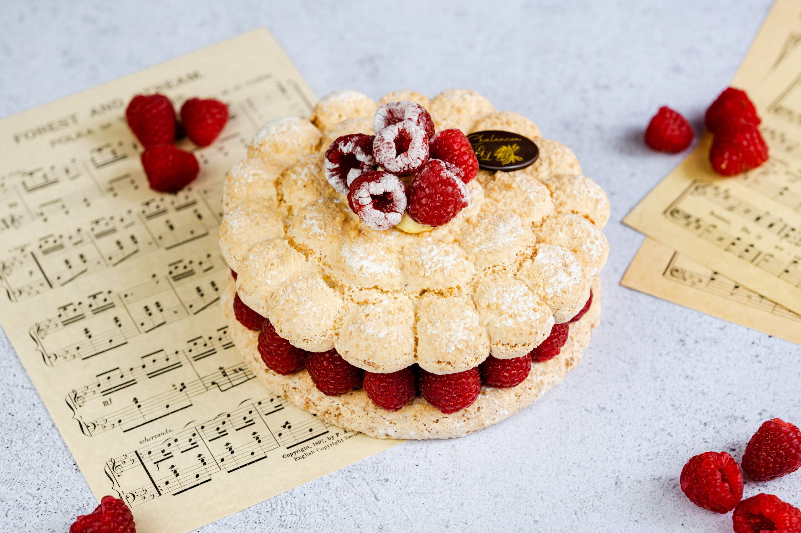 Le Framboisier : Élégant et intemporel, Le Framboisier revisite un grand classique avec finesse et légèreté. Il se compose d’un biscuit macaron moelleux, d’une crème légère à la vanille délicatement parfumée, et de framboises fraîches qui apportent éclat et fraîcheur.
