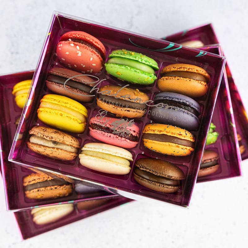 Macarons artisanaux : Craquez pour nos macarons délicatement croquants et fondants, déclinés en une palette de saveurs gourmandes : vanille, chocolat, Nutella, passion, fraise, cassis, citron, marron, spéculos, pistache, framboise-litchi, chocolat lait croustillant praliné et caramel beurre salé. Une explosion de douceur et d’élégance à chaque bouchée.