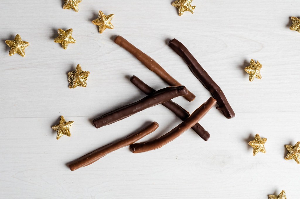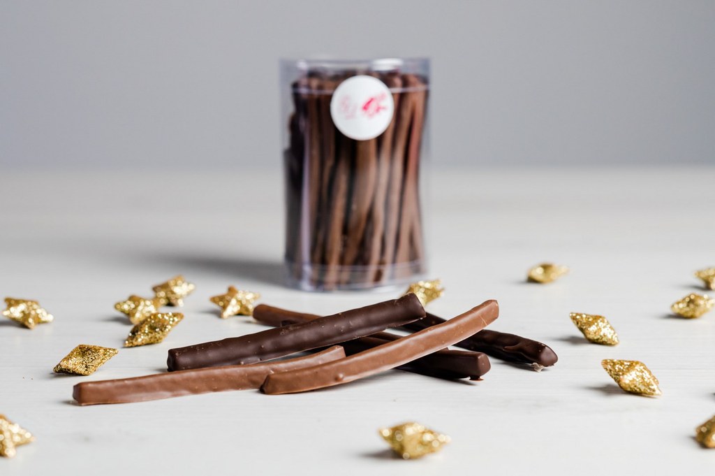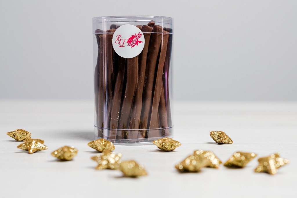 Orangettes artisanales : Nos orangettes artisanales sont de fines écorces d’orange confites, délicatement enrobées de chocolat au lait ou noir Valrhona.