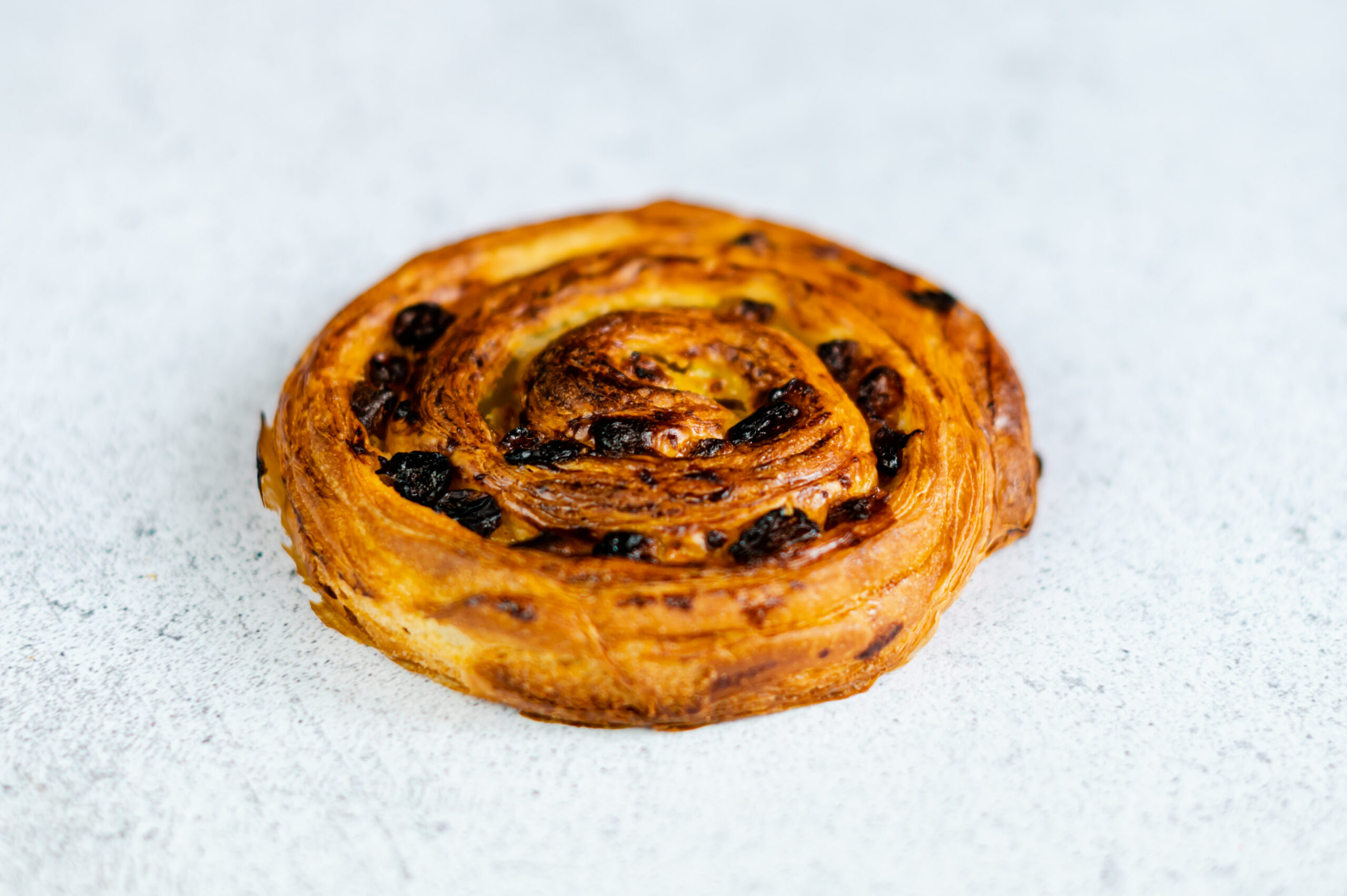 Pain aux raisins artisanal au beurre AOP : Roulé à la main dans une pâte feuilletée pur beurre AOP, notre pain aux raisins allie la finesse d’une crème pâtissière maison à la douceur de raisins moelleux. Doré au four chaque matin, il révèle tout le savoir-faire artisanal et le goût authentique du beurre d’exception.