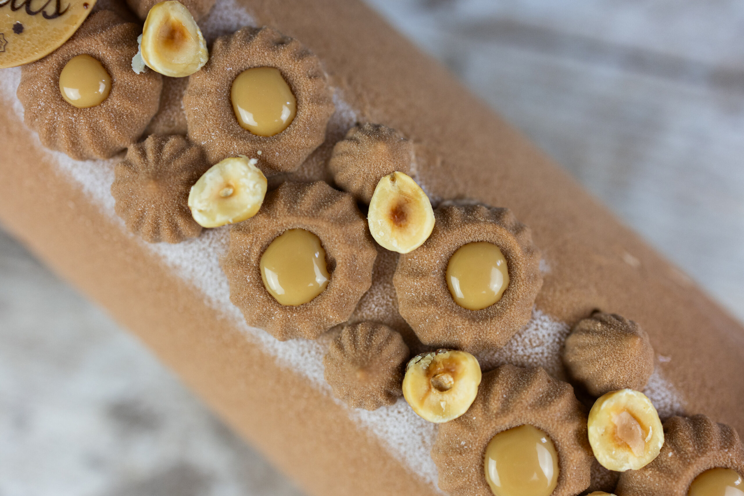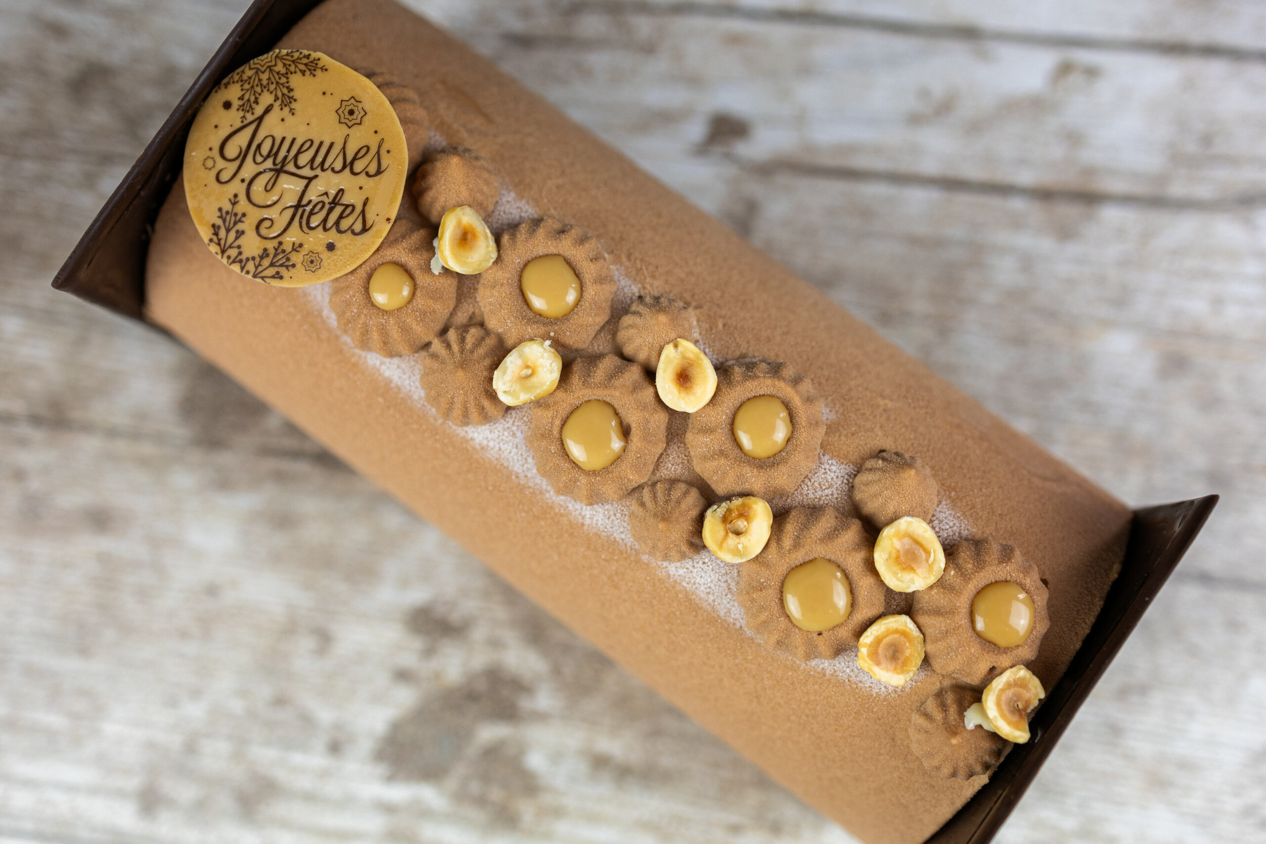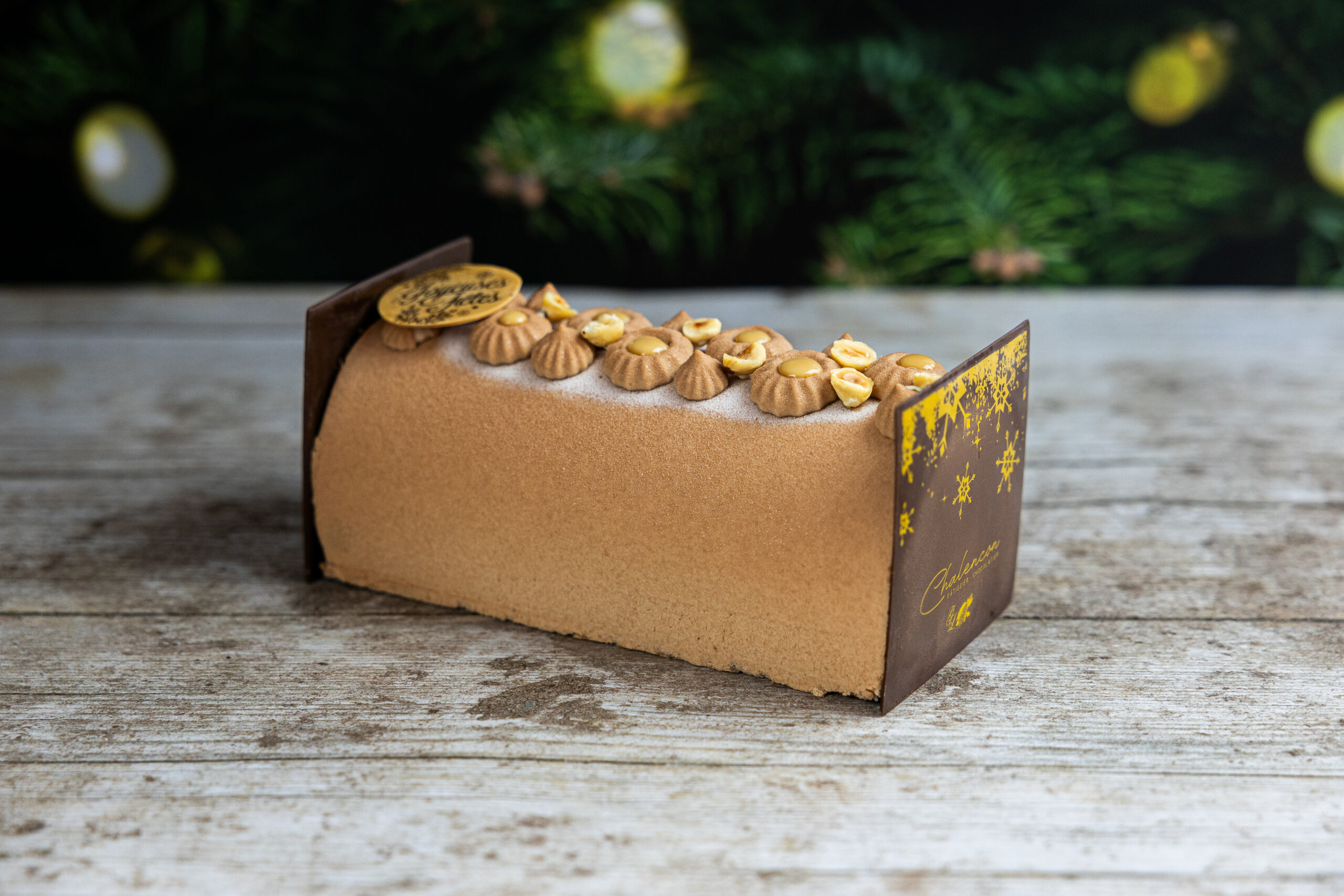 Bûche royale : Sublime et généreuse, la bûche Royale allie un crémeux léger et une mousse onctueuse au chocolat caramélia 36%, sur un croustillant praliné noisette et un biscuit moelleux aux amandes. Une création raffinée et réconfortante, digne des plus belles tables de fête.