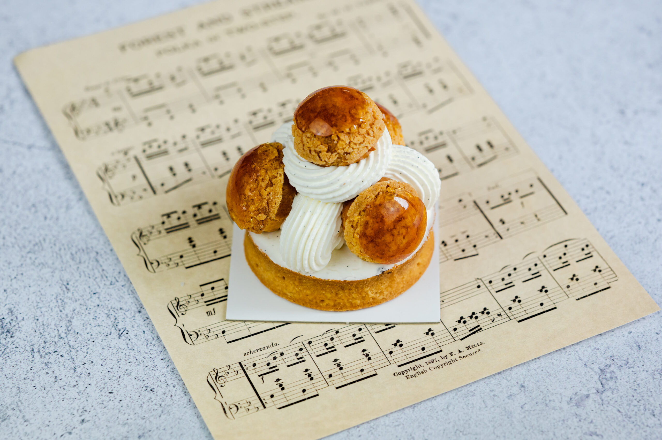Le Saint-Honoré : Icône de la pâtisserie française, Le Saint-Honoré signé Pâtisserie Chalencon séduit par son élégance et son équilibre de saveurs. Sur une base de pâte sucrée croustillante, s’étend un caramel beurre salé fondant, surmonté de choux dorés garnis d’une crème légère à la vanille et d’une chantilly vanille aérienne.