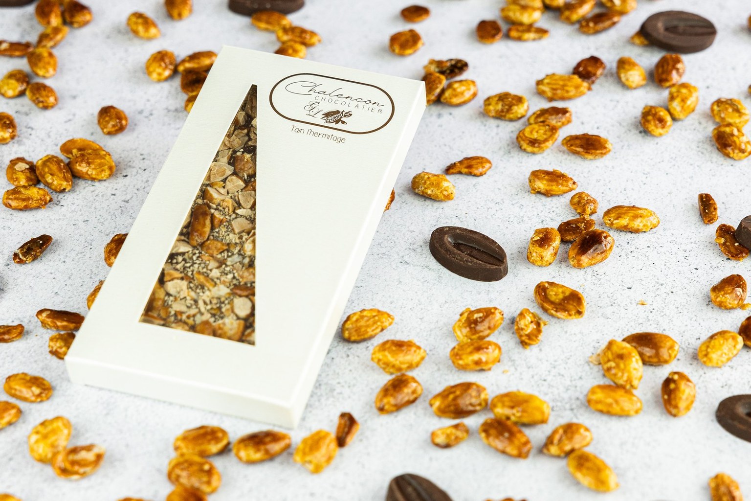 Tablette Extra Bitter 61% Amandes : Notre tablette Extra Bitter 61% révèle toute la profondeur d’un chocolat noir équilibré, aux notes de cacao franc et légèrement grillé. Elle s’enrichit d’amandes caramélisées délicatement torréfiées, offrant un croquant irrésistible et une douceur dorée qui contraste à merveille avec l’intensité du chocolat.